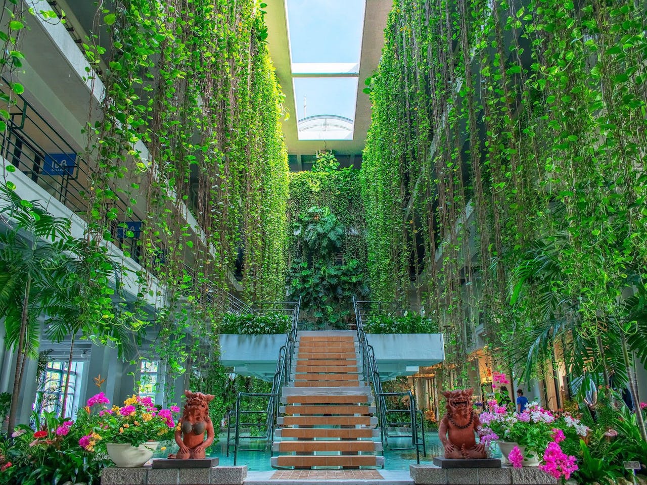 駐車場近くの入口からビーチフロアに入ると、亜熱帯の植物が生い茂るようにあしらわれた高い吹き抜け階段が目に留まります。天窓からはキラキラと日が射し込んで、雰囲気はまさに亜熱帯リゾート。(写真は一休.comのホテルムーンビーチ詳細ページへリンクしています。)