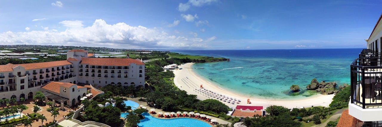 眩しいくらいに真っ白な砂浜と遠くに青い水平線が見える、The沖縄の風景ですね。(写真は一休.comのホテル日航アリビラ詳細ページにリンクしています。)